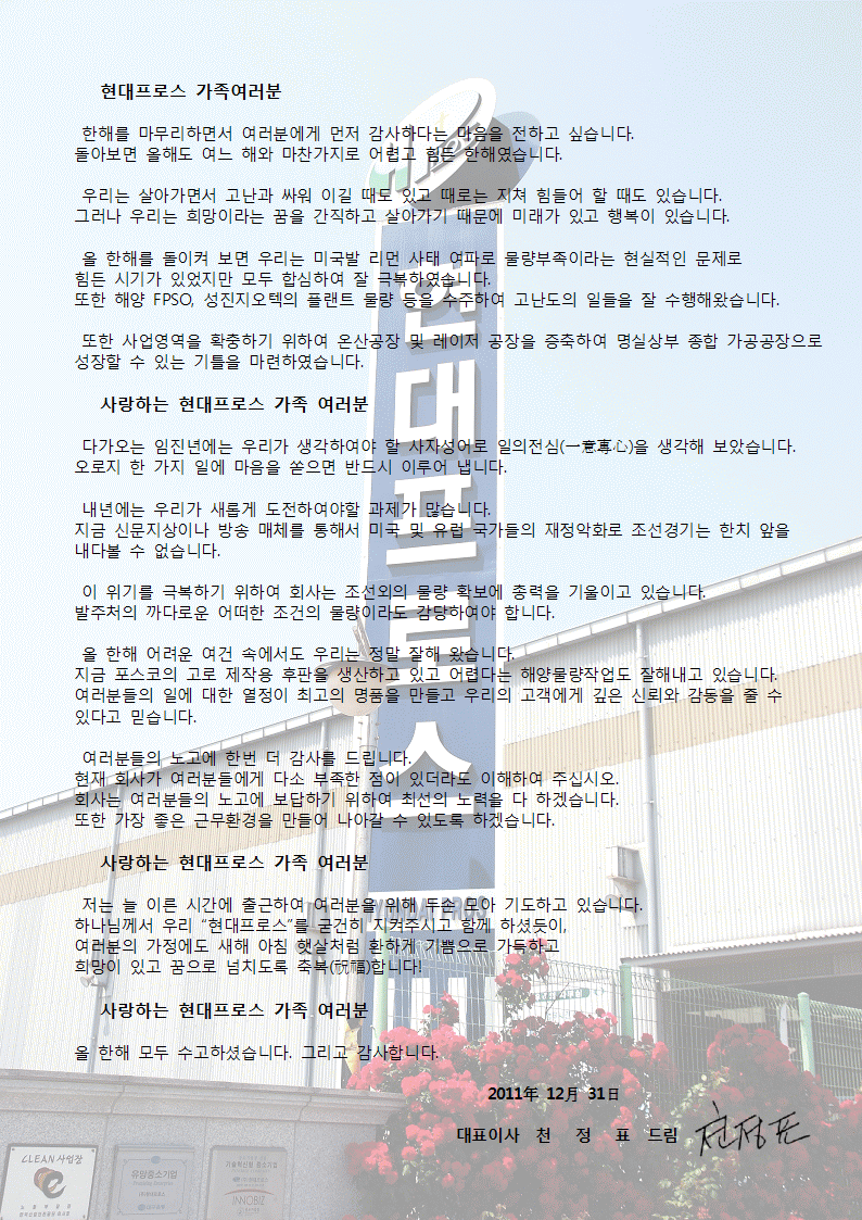 개인적으로 2011년을 돌아보며 감회가 새로웠고, 현대프로스와 함께 할수 있어 감사했습니다.
