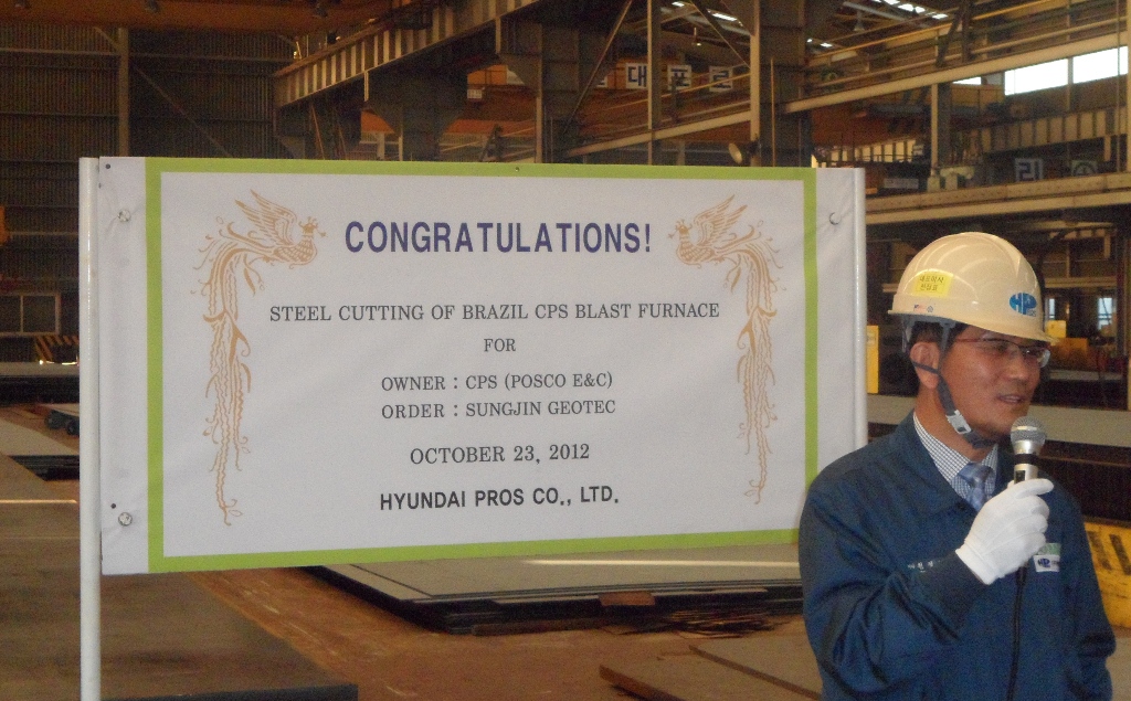 포스코와 포스코의 가족기업인 성진지오텍 그리고 브라질 업체와 합작해서 만든 [CPS]란 회사에서 제철소 고로제작 중 절단부분을 당사에 맡겼습니다. 고로용 절단공사는 인도네시아 제철소와 광양제철소의 고로에 이어 이번이 세번째로 당사의 절단기술을 높이 인정받아 수주하였습니다. 그동안 고생한 직원들과 앞으로 고생할 직원들을 위로하고 좀 더 좋은 품질로 고객사의 신뢰를 받자는 의미에서 자체 착공(Work Commence)식을 가졌습니다.